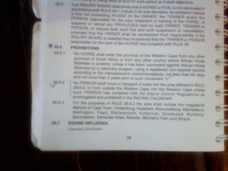 Makes you wonder whether moving horses to the Vaal first is an avenue to the Cape maybe????? maybe there is a loophole? MdK wouldn't just break all the rules I don't think!....................just guessing of course.