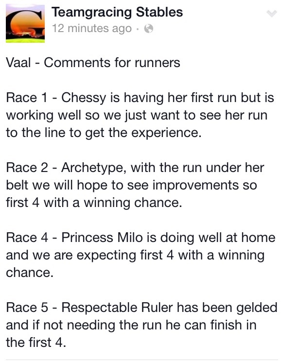 11 years 1 month agoI just realised that after i sent the post, no recall button :pinch: still a runner though dont u think?agra wrote:Merchy wrote: I like a bit of Formal Request in Race 5, decent debut when 3rd behind Sir Cecil (runs in race 3 today). The runner up was only 0.20 lengths ahead of him that day and De Melo chose to keep the ride instead of jumping on the form horse and likely favourite Respectable Ruler.