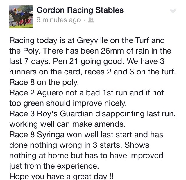Thanks Bob, Dark Rose faces a stronger field today but the fast track last time caught her out. Both Doug and Donovan feel she is better on the grass than the poly and will go well today. She put up a good gallop this week and should hopefully be in the first 3 again. Midanswer ran well last time and could be the one to beat.