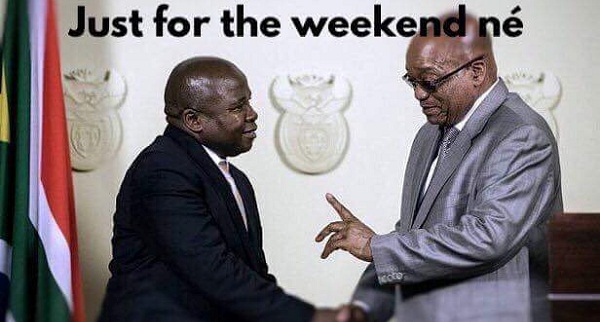 .....which one....we only had 3 of them in the past 10 days.....does the 2nd one count as he was only a finance minister for less than a week.....see from his bio he knows nothing about finances.....well sanity prevails ....the real power must have reigned Zuma in and help put thing right.... even briefly....FFS no one can even take a break and leave this idiot to his own devices..... worse than baby sitting a delinquent chimpanzee....Oops cannot refer these people as lesser primates.....it's classified as being racist.... :S