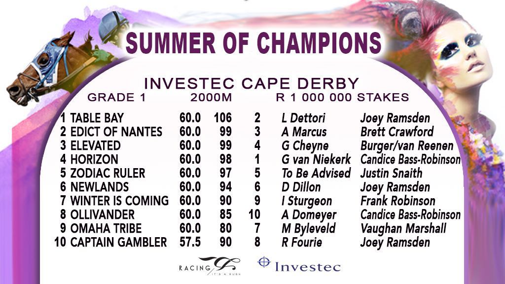Final field and draws for the Grade 1 Investec Cape Derby over 2000m at Kenilworth: