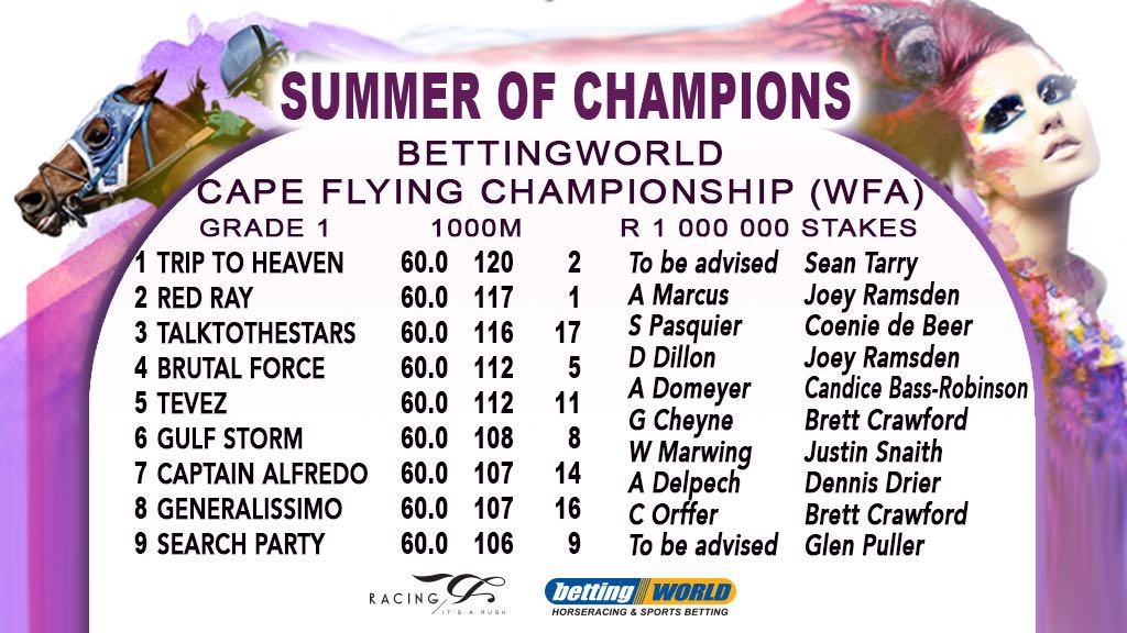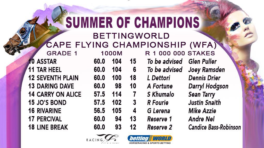 Final field and draws for the Grade 1 Betting World Cape Flying Championship over 1000m at Kenilworth: