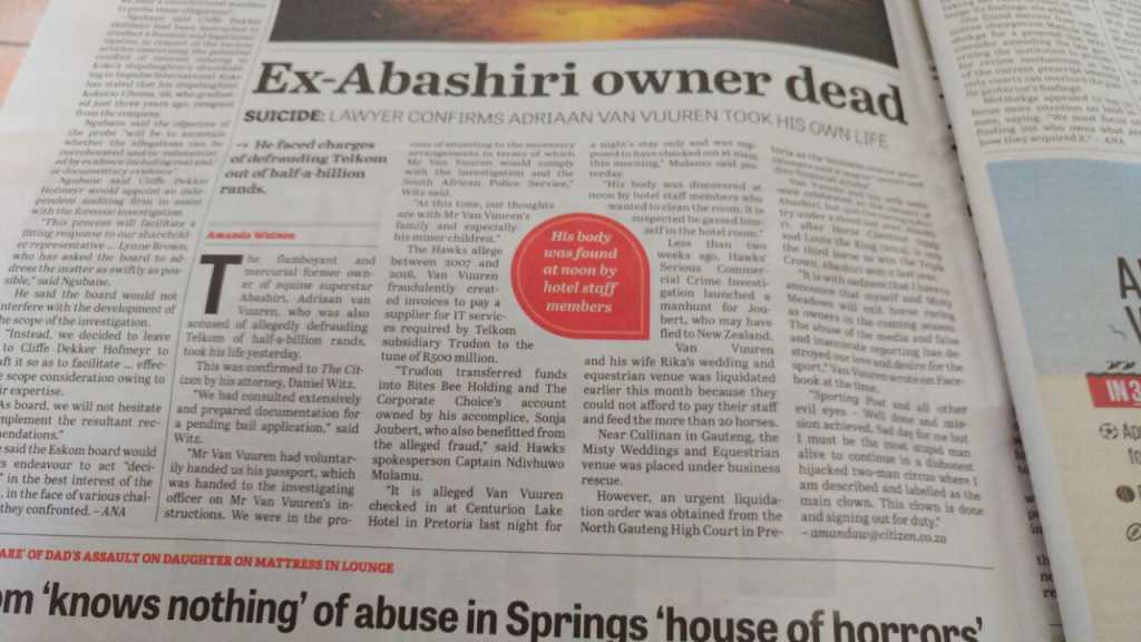 In the Citizens article they say Van Vuuren gassed himself ....