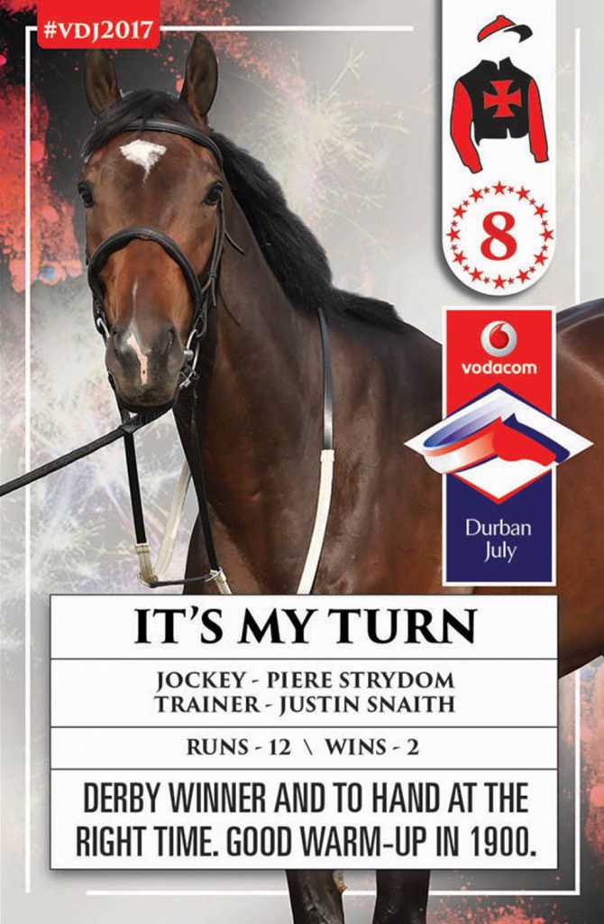 1 its my turn cape derby winner.carrying same weight as last yr wen 4th at 3,striker up.
