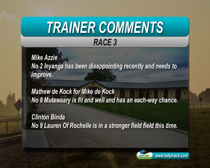 R3: Rebel's Champ one of those who may be needing a run - if not, should prove hard to beat imo; I think the main danger is the filly All Over the World, who came back to form in her last run after some dismal runs - earlier ran well off a 79 and has now come down to 73; Vulcan could be interesting - best form over 1400 at the Vaal, but tries blinkers today (and according to Computaform has won 5 of 34 starts with blinkers); Hot August faces stronger imo but can place; the others can not be totally ignored - so either take a chance with RC or go wide