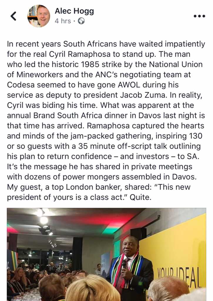 do not 'love' Cyril. However only the willfully deaf and blind would not recognize the change he brings to politics. As I said last night he should be supported 1000% when he's right and DA should as even this abbreviated report states ' become his greatest enemy when he deviates from the anti corruption course he promised. If anyone operating in politics does not recognize that perhaps they should take another look and listen to the zeitgeist abroad in SA and elsewhere right now."