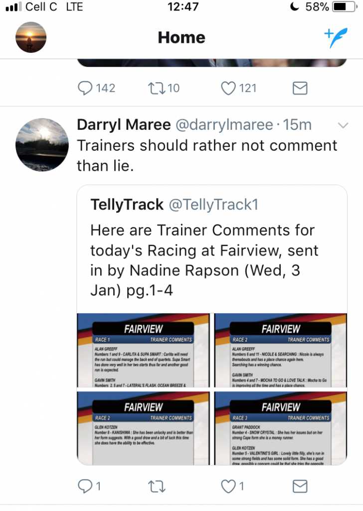 8 years 3 months agodurbs wrote:Exactly Mr.H.If you trying to pull off something rather say no comment instead of making yourself look helluva stupid or purposely try and deceive people.The way they backed that horse surely Greeff knew he was going to get taken to the cleaners if it won.For a bit of money he has thrown his name in the mud and probably no one will trust him anymore and he will always be known as a dodgy character.money to him seems to matter more than being an honest truthful person.mr hawaii wrote:Bob Brogan wrote: The story that she gave weight and a lesson to 5 time winner a few days ago might be true the way she ran