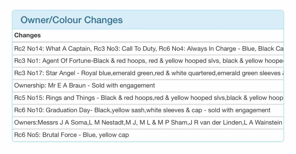 ....on sahorseracing site only 4 horses now have the Jooste/Mayfair colours.....2 still in his/there name alone.....one with the Coolmore crowd as partners and the other with the Finch's....