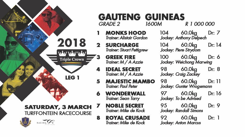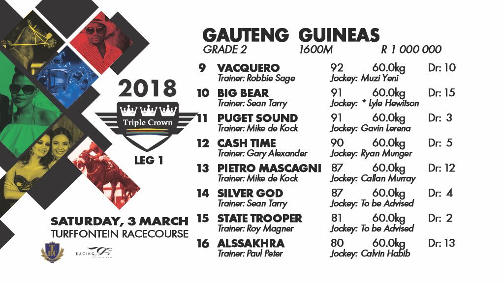 Entries for the R1-million Gauteng Guineas (Grade 2)(1st Leg SA Triple Crown)over 1600m at Turffontein