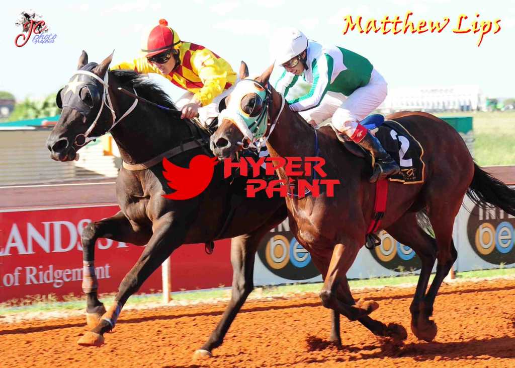 Race 7 - Stable companions fighting it out 5 lengths clear of the field.