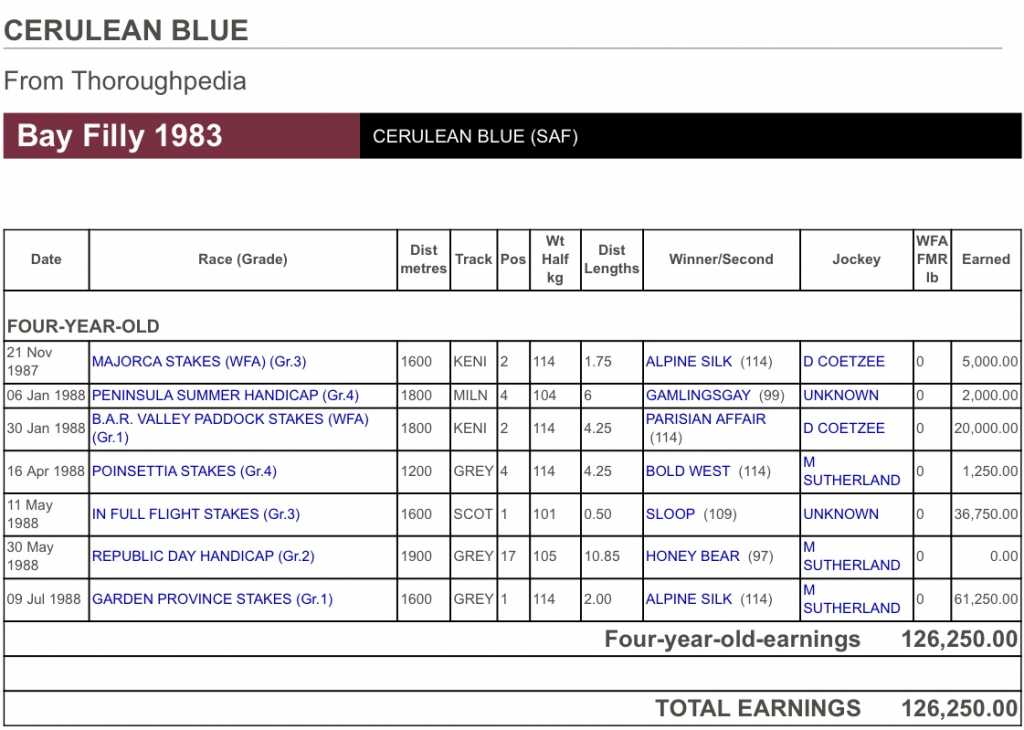 7 years 10 months agopirates wrote: The davis family had many good sprinters with the passmores besides syrian blue they had hooves of gold flash attack and another filly i cant recall her name ..Craig was and is one of the sharpest around ..passmores loved the drum beat off spring in the early days then moving onto the progeny of golden thatch..im sure they had plenty of the progeny of the mare soul and algernon percy springs to mind i think he started with the passmores ..intellectual raced with the passmores until he was 10 or 11 and still won at that age ...it was the stuff of folklore in those days and the day regents heir won his maiden IN THE C DIVISION OVER 1600M WITH CHARLES ROBERTS ABOARD THE BOOKIES AT LOVEDAY SYREEY WERE EATING BREAD AND WATER FOR A WHILE ..great memories