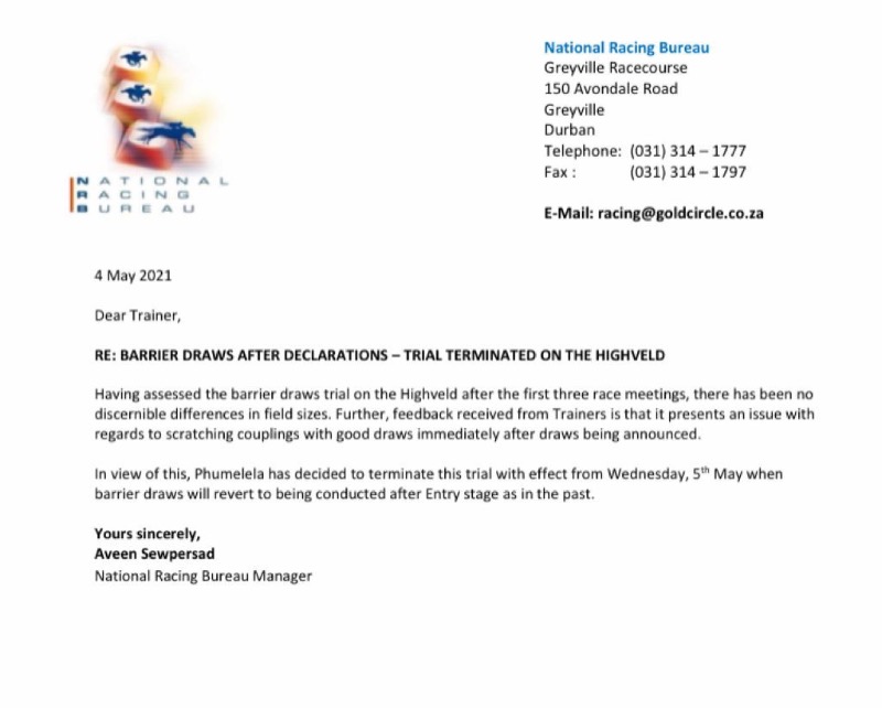 Dave, basically everything, noms, scratchings etc is run from offices at Greyville.