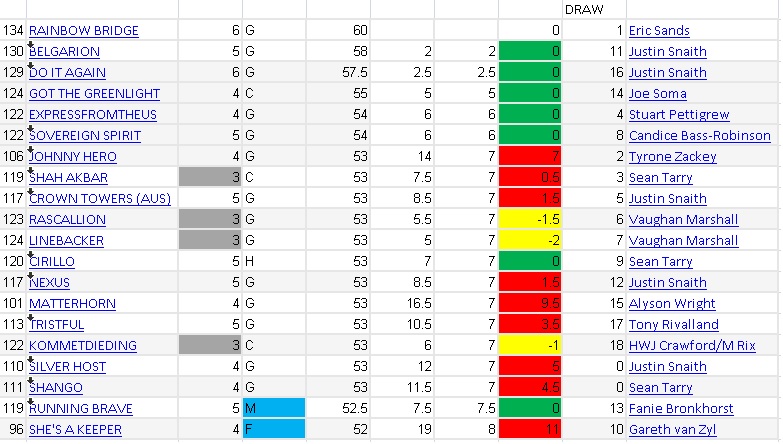 Guys help me understand this. I'm a huge rainbow bridge fan. But how can it be that in a big race there are only 3 horses above 55 kgs. How can RB give 7 kgs to majority of the field. I hate to say it but do it again has been under the radar at that weight. People have been saying the are a number of no hoppers, but we should remember that a number of unfacied horse in the past have filled the First 6 spots in July. A lot of luck in the running is needed. My boxed qt Linebacker, do it again, RB, she's a keeper, rascallion, trustful, kometdieding.