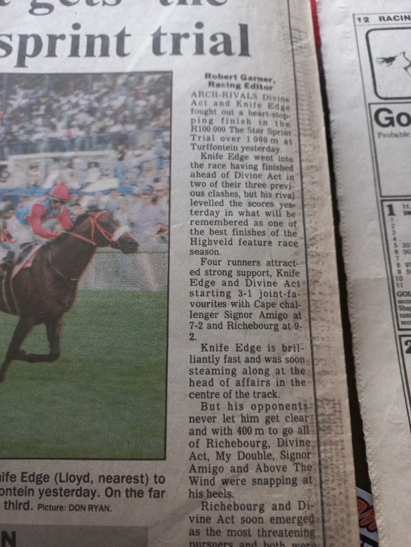 We bought him , reschooled him in the gates and raced him in the bushveld, he was a beast of a machine . I rode him in work and rode him in my last ever race as amateur jockey in July 1995 when i was only 16 years old, weighing 64kg. Most powerful horse i ever ridden or worked with.