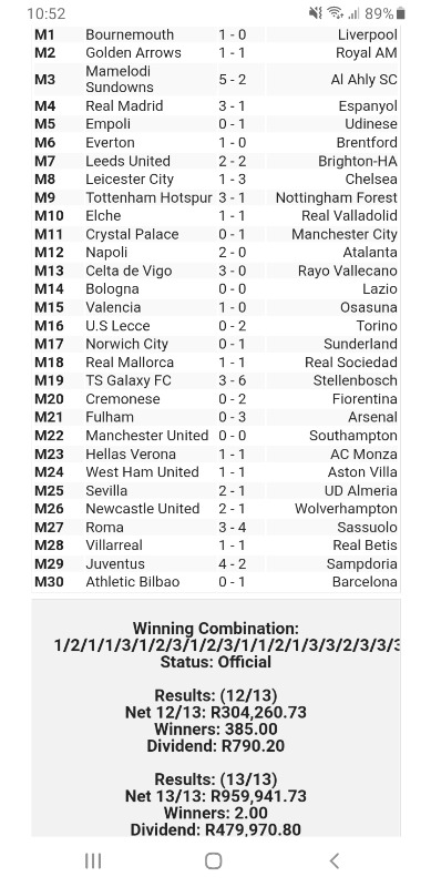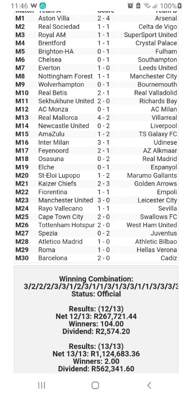 Two lucky winners of the Soccer Any 13 for the weekend of 11 March 2023. It paid 479k. For a small investment you can hit it bag. These were my permutations. Came close. Could have gone with Barcelona, Arsenal and or Sevilla in one permutation to catch it as I was omitting some big teams incase of a loss or draw.