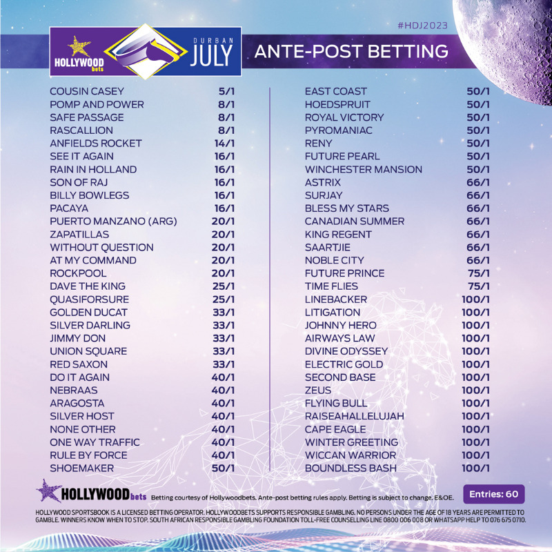 “It’s a joy to have Hollywoodbets as headline sponsors and they did a fantastic promotional job at short notice last year,” said Gold Circle Racing Executive Raf Sheik. “The race has again attracted the best horses in the country and we are all set for another tremendous renewal of the Hollywoodbets Durban July.”