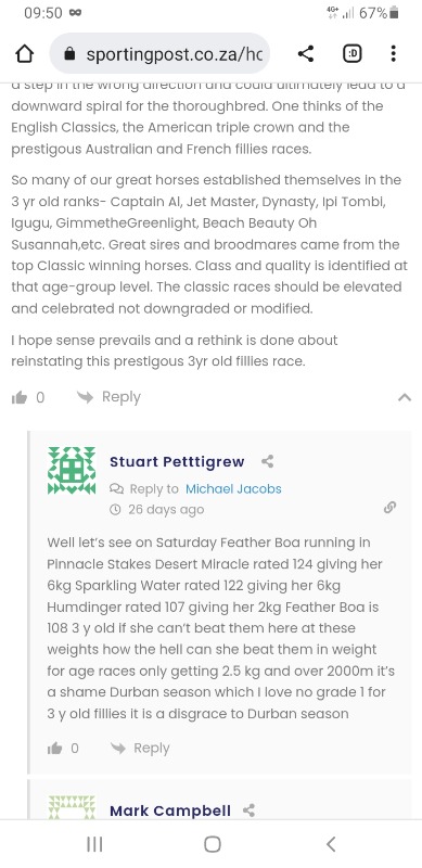 I think Feather Boa is one of the better fillies and mares in South Africa. Interestingly this is what the trainer commented recently....