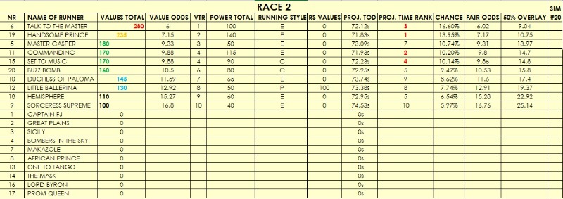 The main ratings to keep an eye on are VALUES TOTAL and VALUE ODDS (the latter is the software's odds line). POWER TOTAL values are based on 'conventional' racing wisdom and may reflect who the public will favor. Keep an eye on the PROJECTED TIME RANK (esp. over shorter) - I have found often those throw up some value.