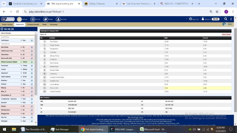 .....doubt if any "lucky" punter is getting on after the jump.....there seems to be major manipulation in the system as certain horses are shedding points in running and even after the post.....this seems highly orchestrated and possibly homegrown tampering with a probable fast fingered IT fundi that has knowledge of the TAB software and found a way to loop into the system and tamper with the closing time of bets....I was informed back in the Phumelala days that there as much as a 25sec delay for cancelation of bets on tote machines(hardware) on course and in many now non existent tote outlets....