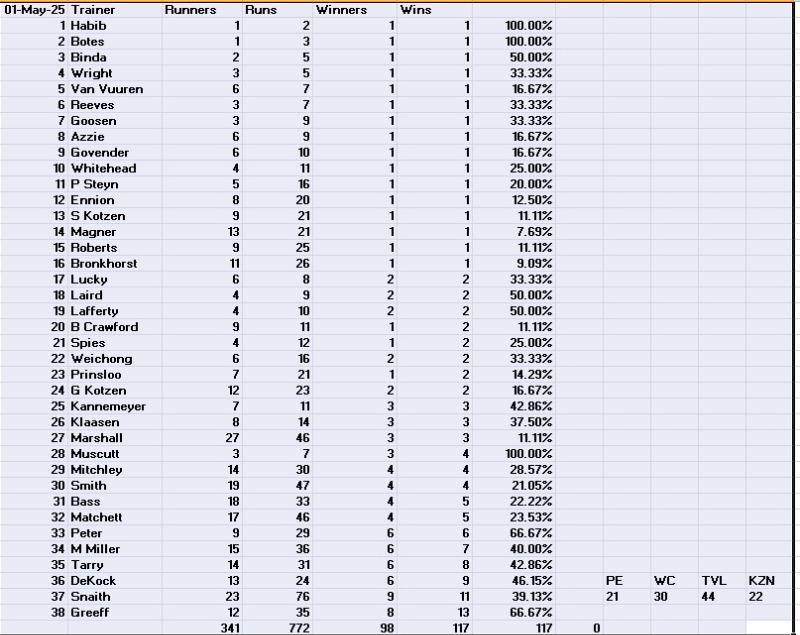 38 of 114 Trainers have had at least 1 2 year old winner this season.