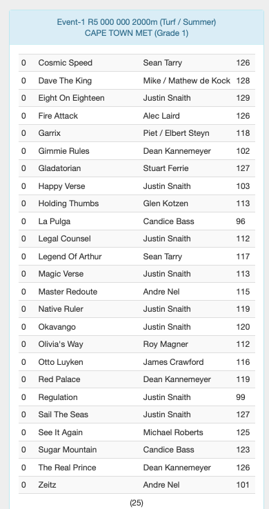 Re: FIRST ENTRIES WORLD SPORTS BETTING CAPE TOWN MET