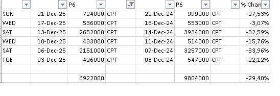 3 months 3 weeks ago - 3 months 3 weeks agoI have attached the turnover for CPT December 2025 and 2024. Comparing like for like meetings in the calendar.