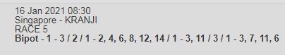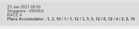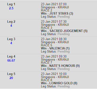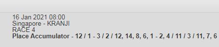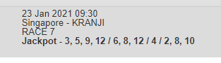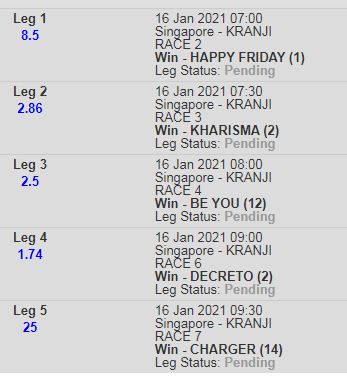Mr Malek seems to face a weak field, should win easily but with Kranji they always bring to the top the one we don't like. I'm not adding it to my Canadian the odds are too skinny, i prefer evens or better. I also like Decreto thou these Class 5 contests always bring upset results. Hope Try See is back to best fitness. My Jackpot legs are last 4 legs of Bipot.