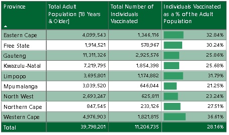 4 years 7 months ago - 4 years 7 months agoSA making steady progress in SA. Pic shows % of population over 18 that have had at least 1 dose of either j and j or Pfizer. Western Cape outperforming other provinces at this stage.