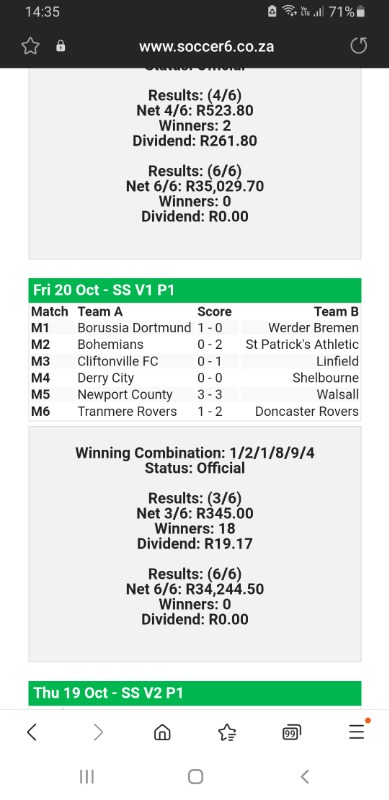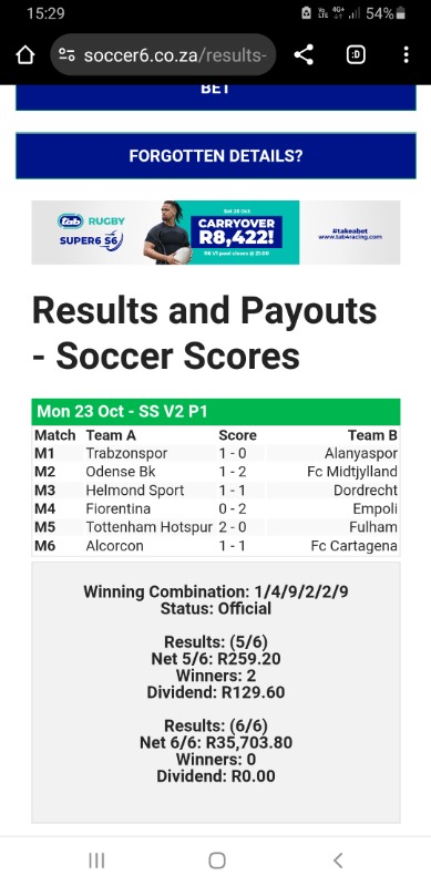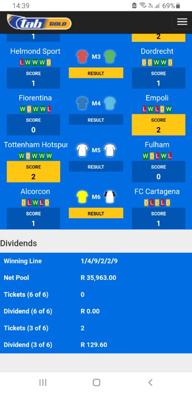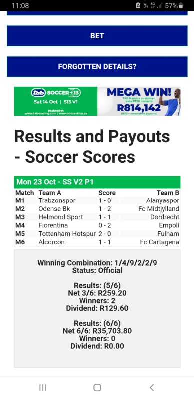 On 23 October 2023 I wagered a bet called Soccer Scores.According to me I had 2 winning tickets for consolation payouts (3 of 6 correct). (R129.60 * 2 = R259.20).However it showed up as losing tickets. Upon query from tab4racing.com they then amended the result to show consolation payouts for 5 of 6 correct after my email. Tabgold shows payouts for 3 of 6 correct. The screenshot is attached of the initial result and the amended result as well as tabgold result.All I ask is for a proper explanation.Note no person as come close to have either 5 or 6 correct. So after my email a person mysteriously get 5 of 6.